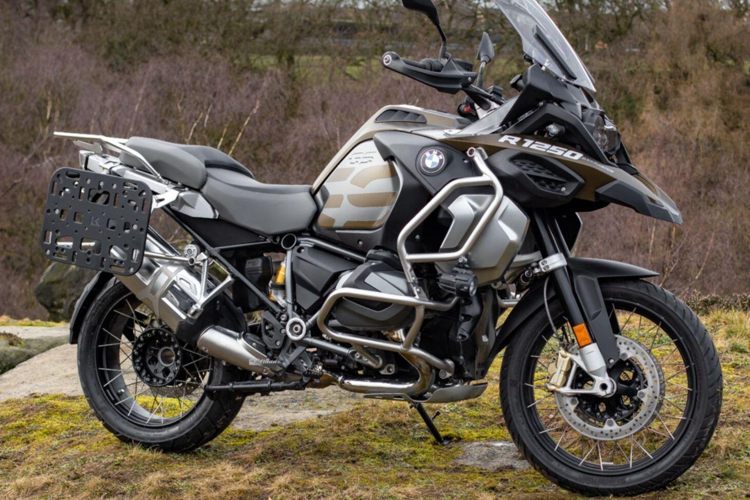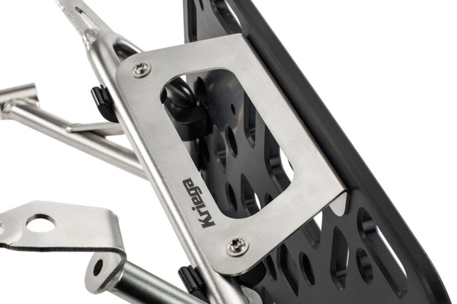 Designed for BMW GS Adventure pannier frames, this laser-cut stainless steel adaptor flattens the exhaust side to securely mount Kriega OS-Platforms and soft luggage.