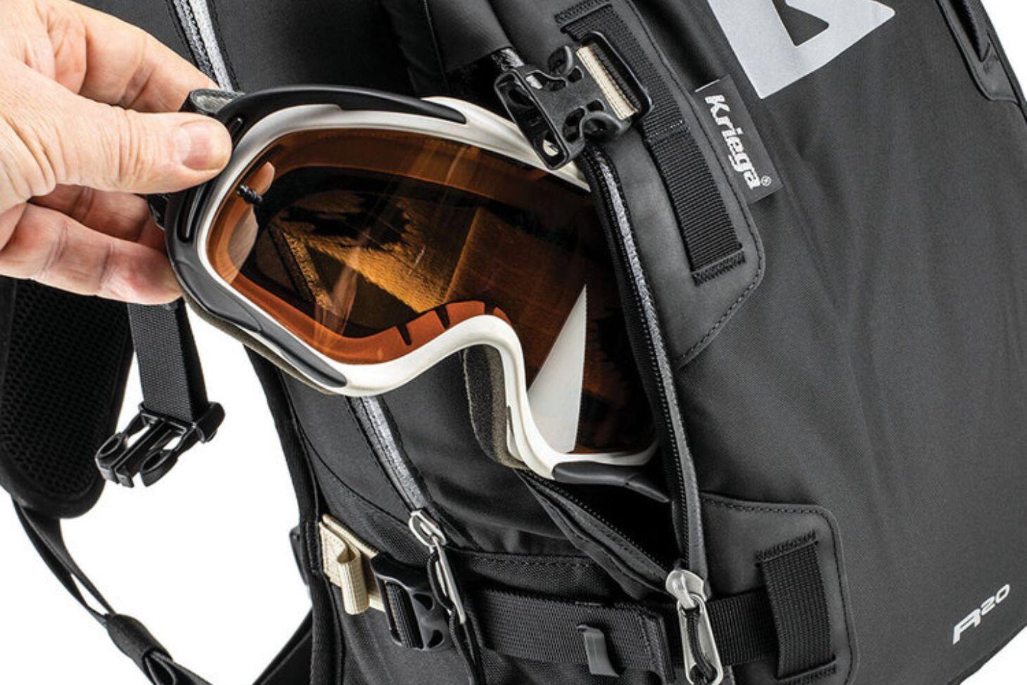 The Kriega R20 Backpack includes a durable zipped side/front pocket for quick access to essentials like tools, goggles, or gloves while on the move. Built with water-resistant YKK® zippers, it keeps your items secure and protected from the elements. The pocket also features hook-on points for attaching a US-Drypack, giving riders the option to expand their waterproof storage without compromising comfort or aerodynamics.