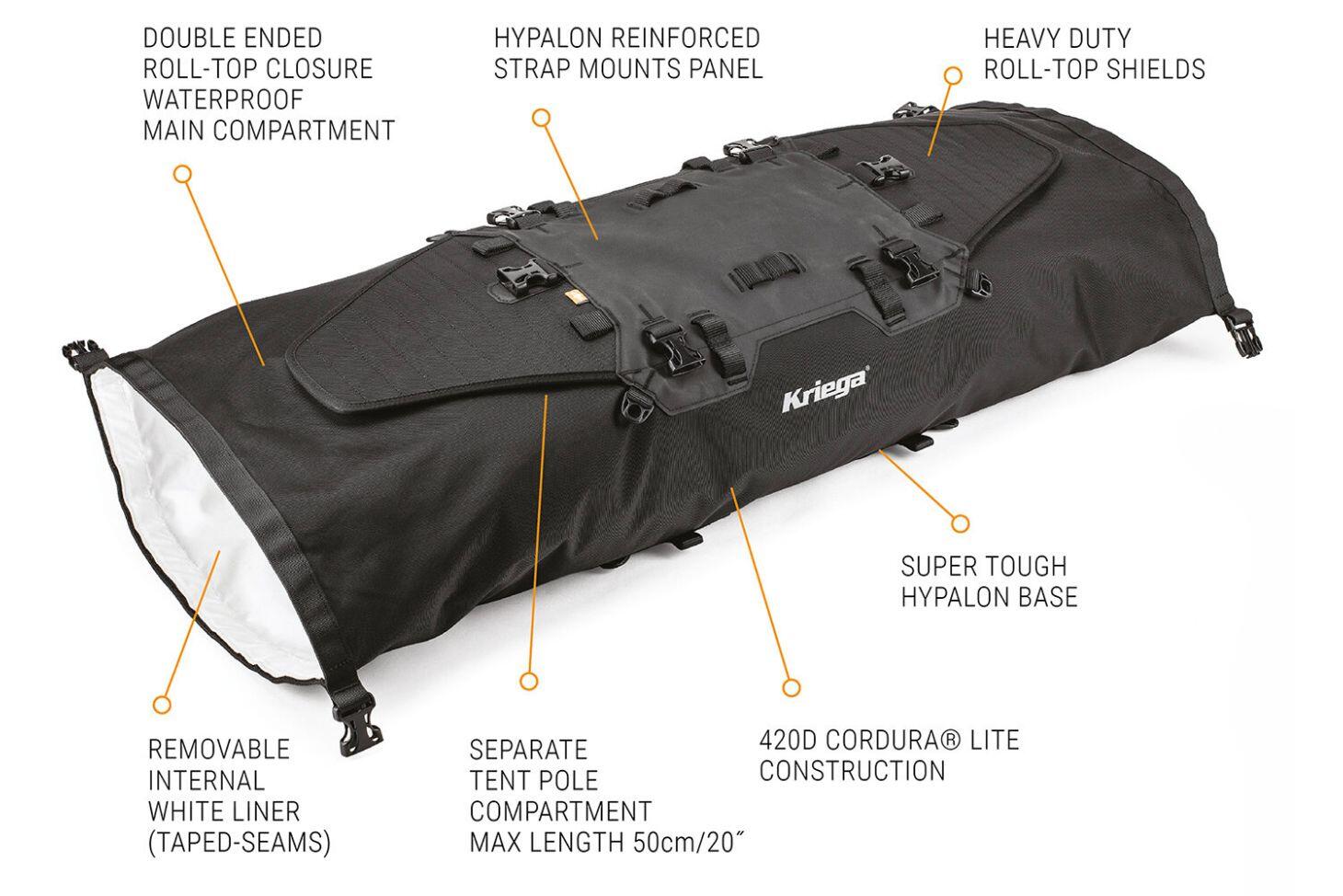 Versatile and waterproof, the US-40 Rackpack expands from 28 to 40 liters, featuring a dedicated tunnel for tent poles and multiple mounting options.
