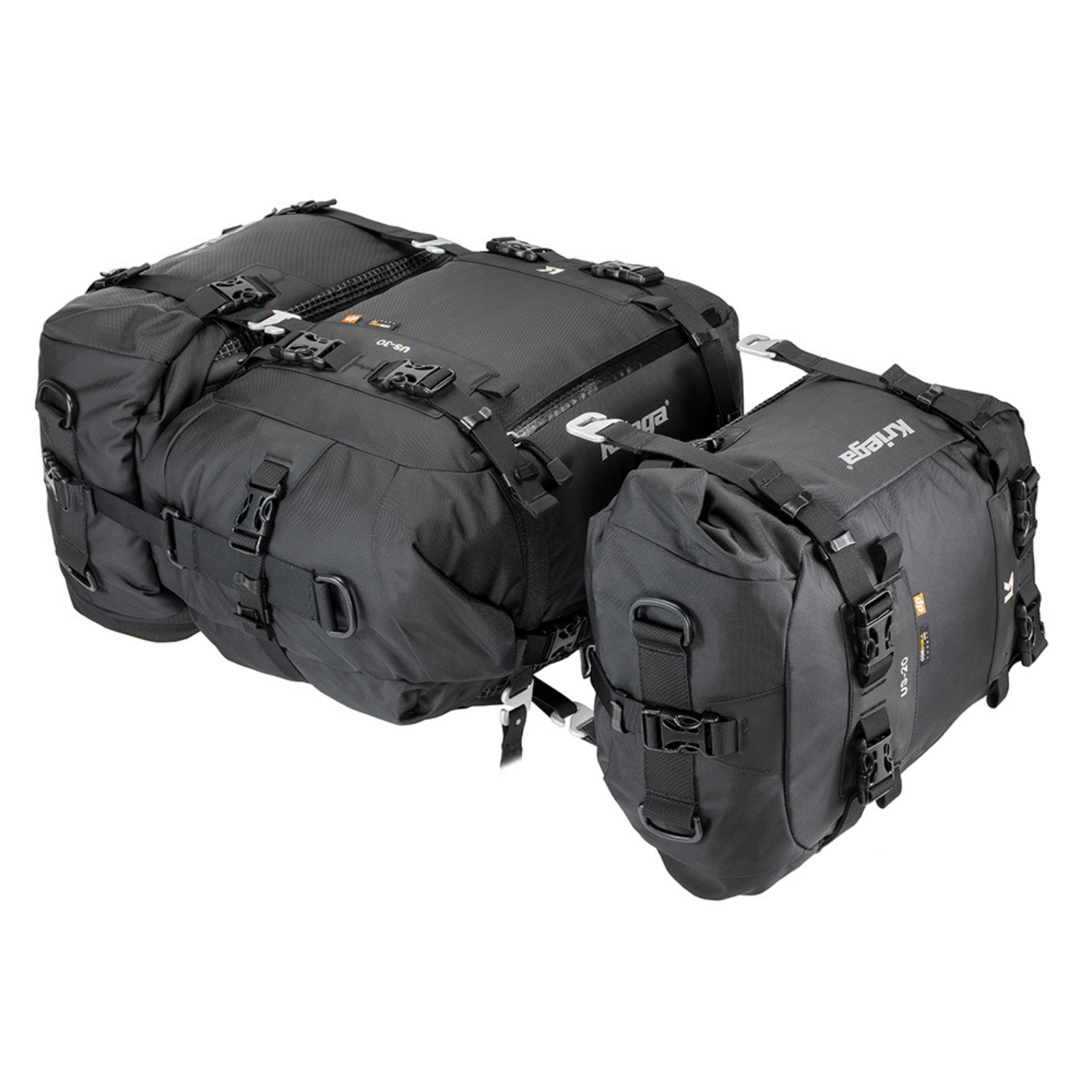 Modular 70L motorcycle luggage system including 1 US-30 Drypack and 2 US-20 Drypacks.